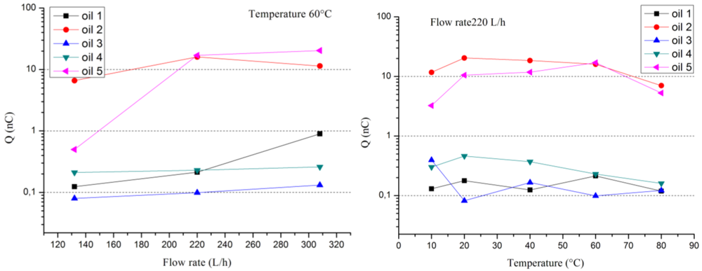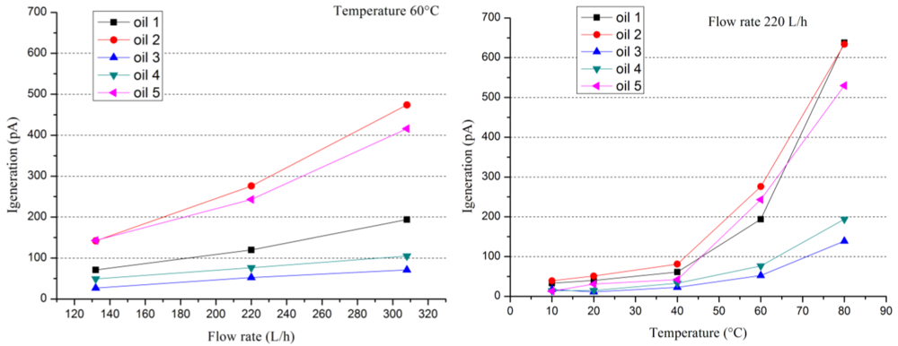 Figures 5 and 6 present examples of the evolution of the current generation (or streaming current) and the charge accumulation versus flow rate, as well as temperature for different new oils and the same pressboard, respectively. Current generation behaviors are quite classical. They increase with flow rate and temperature. The current varies globally between 10 and 1,000 pA with some exceptional lower or higher values. For charge accumulation, the behavior is more complex. In fact, if the charge accumulation increases with the flow rate for all the different oil/pressboard studied versus temperature it is not foreseeable. It could increase, decrease or pass by a maximum or minimum. In fact, the charge accumulation is link to antagonist effects. The temperature raising favored the charge generation process at the interface but, at the same time, it increases the oil electrical conductivity and the charge leakage. Thus, the magnitude of the charge accumulation fluctuates over three decades of 0.1 nC to 100 nC.
