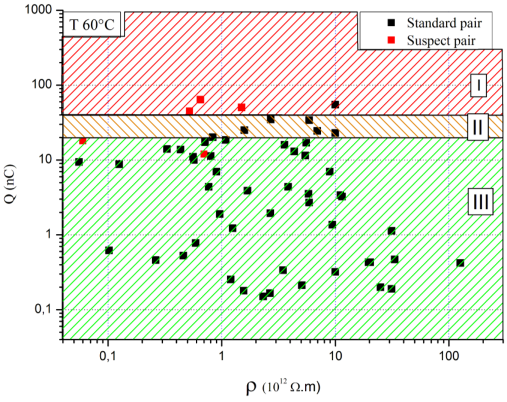 Charge accumulation measurements for standard pairs and suspect pairs versus oil resistivity for one flow rate and one temperature are presented in Figure 7[26]. The most interesting thing in this figure is the charge accumulation values for suspect pairs which are among the highest. The criterion of the accumulated charge seems to be satisfactory to identify a dangerous situation in a power transformer. However a suspect pair may lead to a high value of accumulated charge but without reaching a noteworthy one. Such a pair consists of oil from a transformer where an abnormal hydrogen content was observed. It remained in operation for several years until its withdrawal from the electricity network. On this basis, a graph of hazard assessment (Figure 7) was developed from the values of accumulated charge and oil resistivity. It considers three areas regardless of oil resistivity. An area described as suspicious (I), since in this area the transformer has a risk of developing an electrostatic activity. An area where the operation (III) of the transformer is quite safe with respect to electrostatic hazards. And finally between the two, an intermediate area (II) where measurements may differ whether the oil/pressboard pair is new or used. Statistically, we have shown that oils along time generally undergo an increase of the accumulated charge. Thus, the accumulated charge of a new oil, which had an initial value included in Zone II, may become classified risky with aging, while for a used oil, the value is acceptable. To build this graph, two choices were made and supported, on the one hand the shape of the separation areas, on the other hand the threshold values of these areas. They are justified by statistical analyses and the literature [27,28].