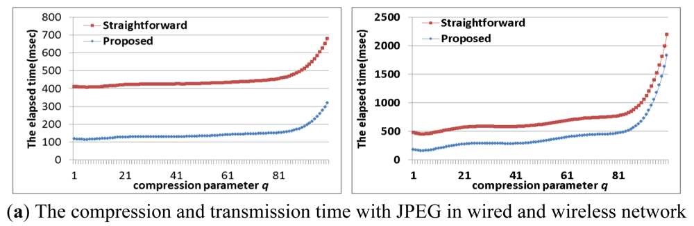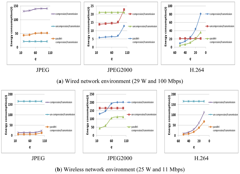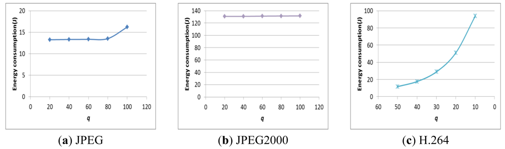 Figure 8 shows the energy consumption and the image/video quality with the q parameter. We found that q affects both the compression energy consumption and the transmission energy consumption. To minimize the total energy consumption, we need collective analysis that considers machine and application characteristics.