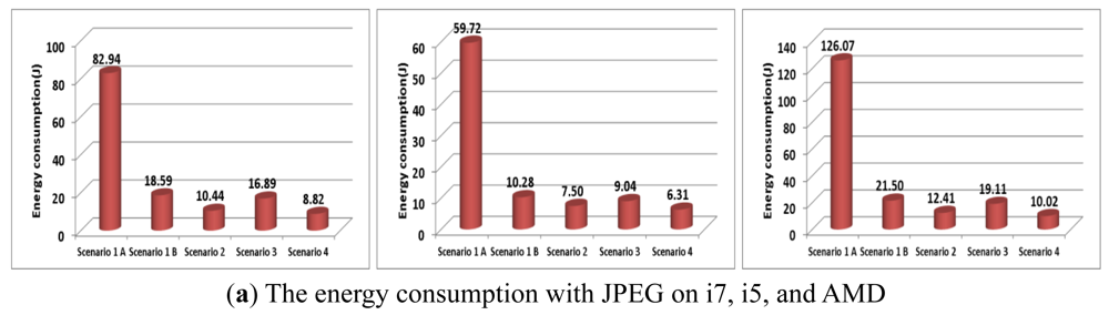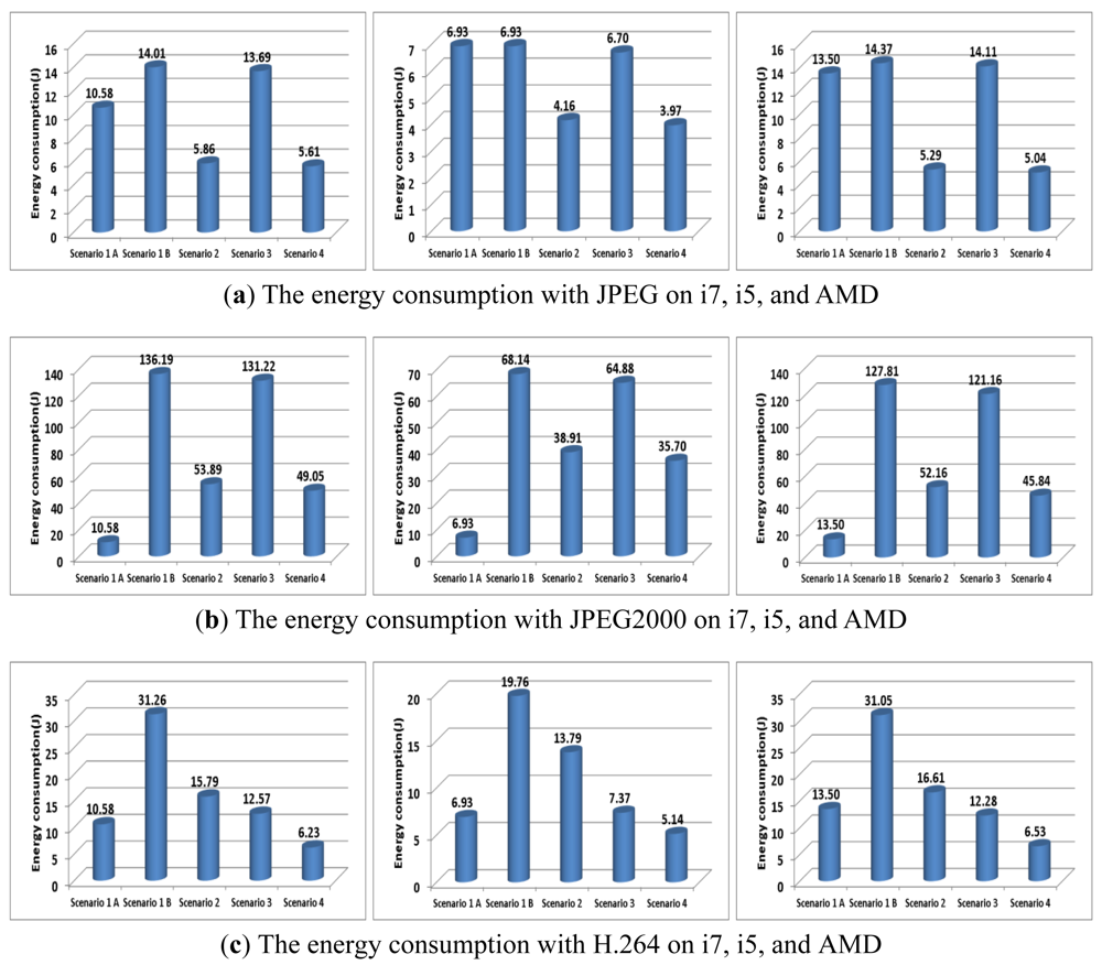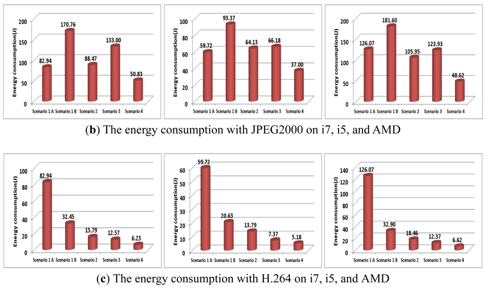 Finally, the scenarios 1, 2, 3, and 4 on each machine are shown in Figures 15 and 16. In the given environments, scenario 4 (i.e., E-D analysis) can provide the minimum energy consumption. The wireless network consumed more energy than the wired network. With JPEG2000 in the wired network environment shown in Figure 15(b), the energy consumption of scenario 1-A (i.e., un-compression) was less than that in scenarios 2, 3, and 4. However, scenario 4 can provide the minimum energy consumption with the wireless network, as shown in Figure 16(b). Since the energy consumption of H.264 is more affected by the multimedia compression parameters than the machine parameters, scenario 3 consumed less energy than scenario 2. However, scenario 4 can provide the minimum energy consumption, regardless of the network. Therefore, in the given environments, we can improve the energy consumption by using E-D analysis for a given image/video quality.