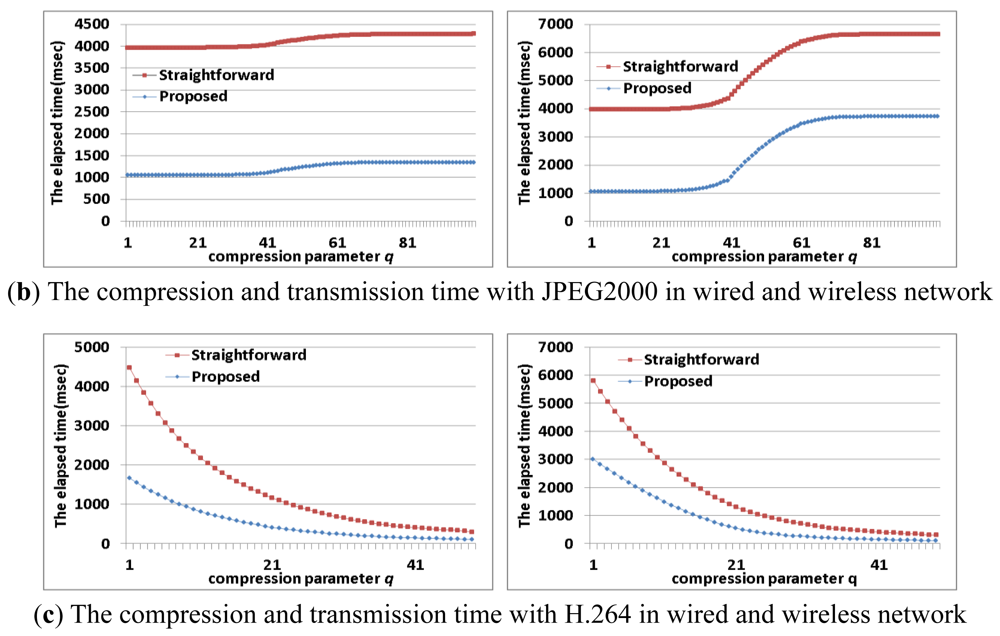 To evaluate the energy efficiency that results from using the E-D analysis, we compared several scenarios and the proposed approach as shown in Table 8. The baseline scenarios 1-A and 1-B are for the un-compression/transmission case and the compression/transmission case, respectively. In scenario 1, we examine the frequency as a single core and maximum frequency. Also, we set the q parameter as 25 (i.e., H.264) or 50 (i.e., JPEG and JPEG2000). The scenarios 2 and 3 are for the computer architectural approach and the multimedia compression approach, respectively. In scenario 2, we set the optimal machine parameters (i.e., frequency and the number of cores), and the compression parameter (i.e., q) as 25 or 50. In scenario 3, we set the optimal compression parameters, and used the maximum frequency and 1 core. Finally, in scenario 4, we set the optimal machine and compression parameters collectively by using the E-D analysis.
