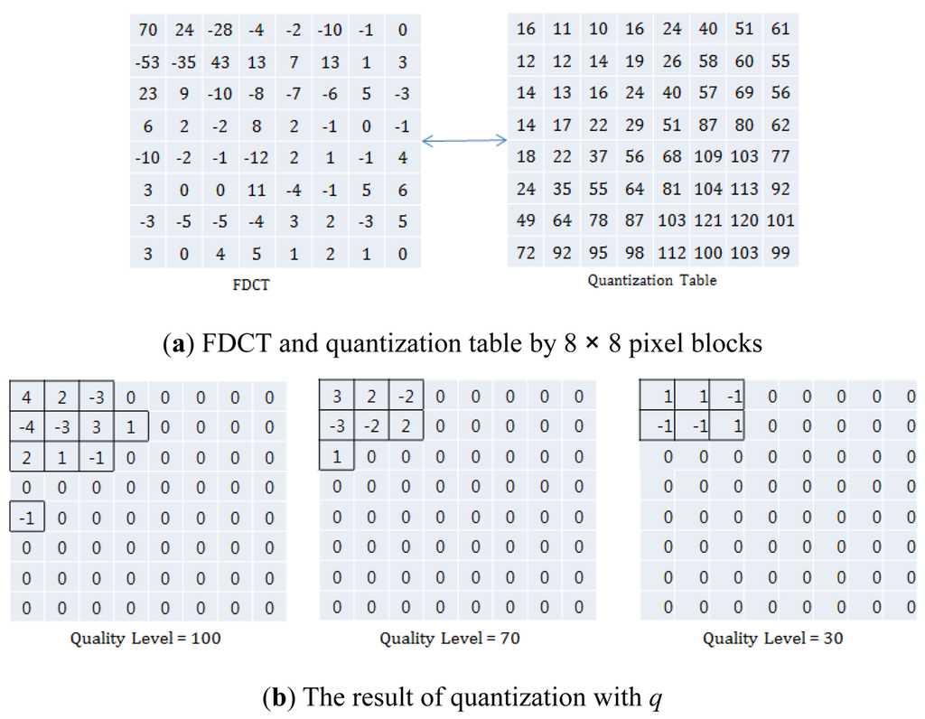 In the compression procedure, the image/video is processed by 8×8 pixel blocks. Figure 2(a) shows an example of FDCT and Quantization Table by 8×8 pixel blocks. In Figure 2(b), the FDCT and Quantization Table results are calculated by (FDCTij/QuantizationTable) × q/100, where q = 1, 2, …, 99, 100. Since the number of zeros is increased with decreased q, the computation of lossless compression and the compressed image/video size are decreased, and the image/video quality is also decreased. Note that, the computation of lossless compression is maximized where q = 100, and also the image/video quality is maximized. In contrast, the computation of lossless compression is minimized where q=1, and also the image/video quality is minimized. Therefore, we can control the amount of computation, compression rate, and image/video quality with q [2–4].