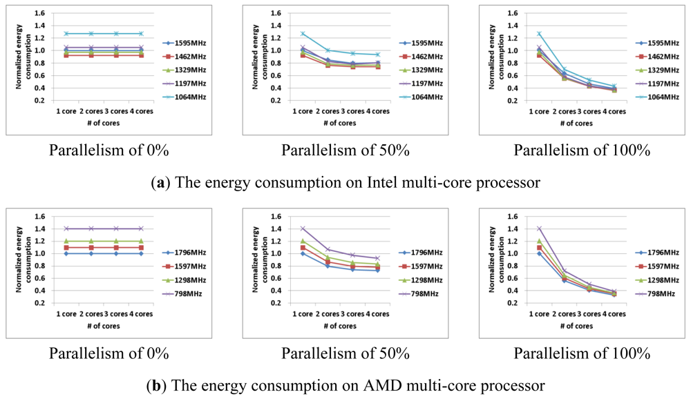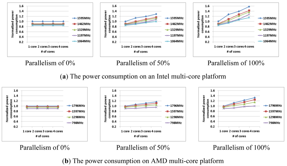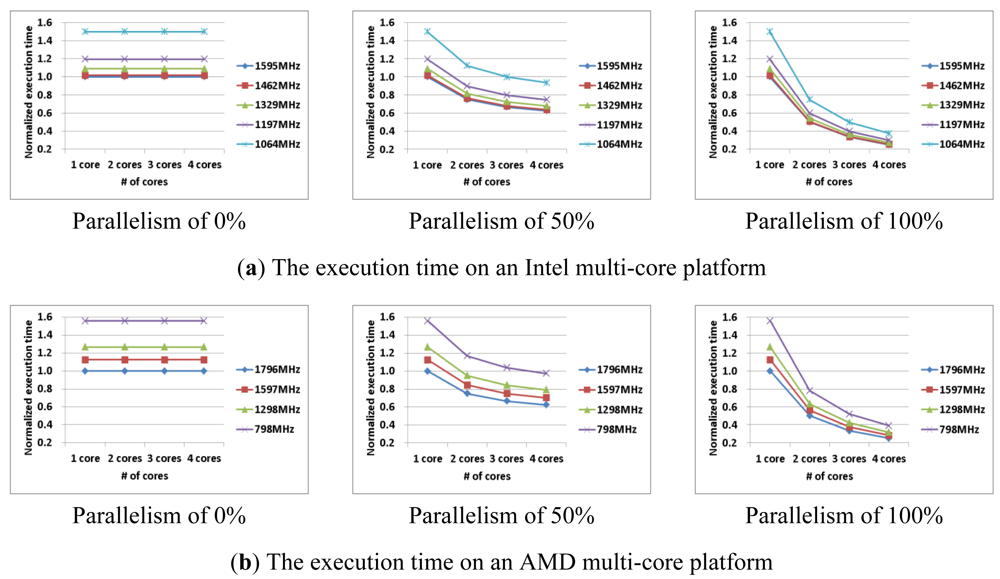 Figure 3 shows the power consumption and execution time of the test applications with 0%, 50%, 100% parallelism on multi-core processors, with various frequencies and numbers of cores. The power consumption, the execution time, and the energy consumption were normalized based on the case with a single core and maximum frequency. As shown in Figure 3, the power consumption increased and execution time decreased with increased frequency and number of cores. In the results, it can be seen that these characteristics have similar patterns for each processor. Since increasing or decreasing rates of power consumption and execution time are different across processors, the power consumption and execution time of a processor should be measured at least once in order to analyze the processor's characteristics. As shown in Figure 3, we found that applications with less parallelism can use fewer cores, and thus less power is consumed.