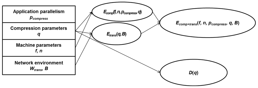 Note that papp is a given parameter which can be gained by application parallelism. The energy consumption can be represented as Equation (7), which consists of compression energy Ecomp and transmission energy Etrans. Ecomp is represented by a compression parameter q as in Equation (7):