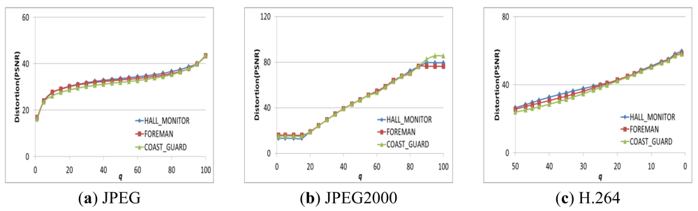 In multimedia compression, the type of DCT, DWT, entropy coding and the size of the quantization table, etc., can be used as compression parameters. In this paper, we represent the compression parameter as q (i.e., Quality Level of JPEG/JPEG2000, and Quality Parameter of H.264). The purpose of q is to control the compression rate and image/video quality with a scalable quantization table. q affects not only the image/video quality, but also lossless compression part (i.e., entropy coding) after lossy compression (i.e., DCT or DWT).