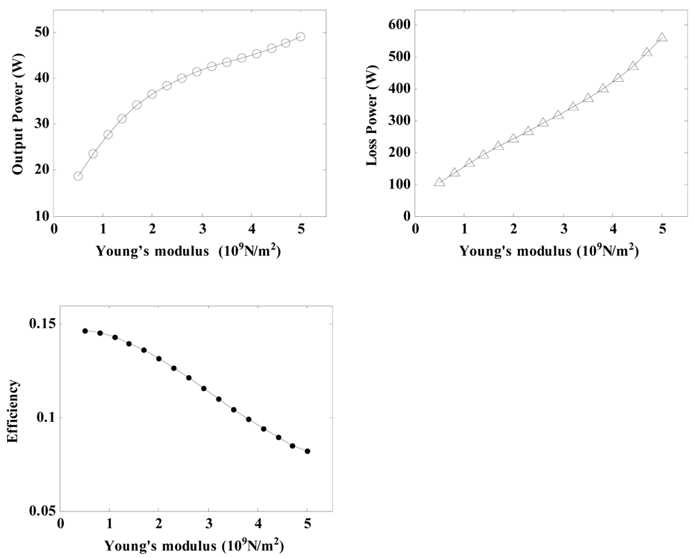 As a result, plots of the output power, loss power and conversion efficiency versus the Young's modulus are shown in Figure 10. It can be seen that an increase in the elastic modulus causes the power output and the loss power to increase at an accelerated rate, whereas the conversional efficiency falls gradually. As a result, if a relatively value for high conversion efficiency is demanded, the Young's modulus of the friction material should be chosen to be between 1 × 109 and 2 × 109 N/m2.