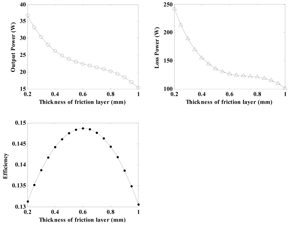 By using the related parameters of the regulator depicted in Table 3 and Equations (21), (26), (29), (30), (31), (32), (33) and (34), the relationship between the Young's modulus and the regulator characteristics can be calculated. As a result, the output power, loss power and conversion efficiency for the regulator plotted versus the thickness of the friction layer (varying between 0.2 mm and 1 mm) are shown in Figure 11. It can be seen that as the thickness increases, the output power and loss power show similar downward tendencies. The conversion efficiency exhibits significant higher values when the thickness of the friction layer varies between 0.5 mm to 0.7 mm. On the basis of these analyses, it is confirmed that the friction layer thickness should be controlled to obtain higher conversion efficiencies. Therefore, 0.6 mm is chosen to be the thickness of the friction layer in this research.