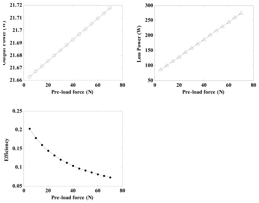 By using the related parameters of the regulator depicted in Table 3 and Equations (21), (22), (29), (30), (31), (32), (33) and (34), the relationship between the pre-load force and the regulator characteristicsfor a friction layer thickness of 0.6 mm can be calculated and shown in Figure 12. The plots indicate that the output power and loss power increase with the pre-load force in a certain range. Simultaneously, the conversion efficiency decreases gradually. High pre-load forces not only induce wear but also produce stall torques that result in the regulator becoming jammed. A value of 20 N is chosen for pre-load force in this research.
