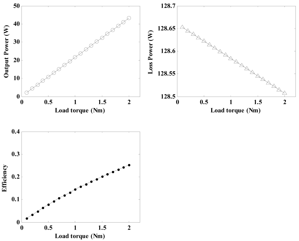 It can be seen that the output power and conversion efficiency show similar upward trends with an increase in the load torque. However, the loss power decreases gradually. Therefore, an increase in the load torque will not increase the loss power, which is produced by the friction between the stator and the rotor.