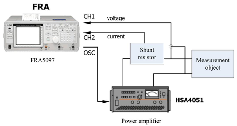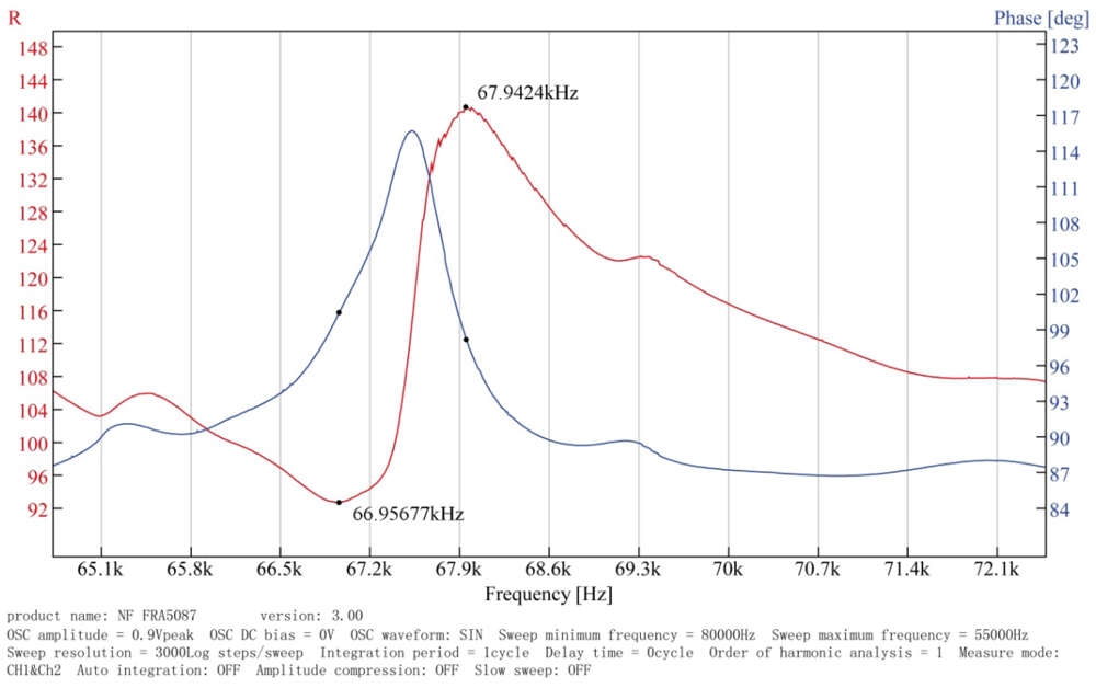 Through the analysis of the dynamic model of the regulator by means of MATLAB, the simulation results allow one to determine the key parameters of the regulator. Using the parameters shown in Table 2, a prototype was fabricated, and its performance was tested experimentally. To verify the analytical and numerical modal analyses of the regulator, an experimental test bench is established primarily to measure the operating frequency of the in-plane bending vibration of the piezoelectric stator, as shown in Figure 14. The test bench includes a frequency response analyzer FRA5097 to generate the excitation signal, a power amplifier HSA4051 to amplify the signal to excite the stator, and both instruments are products of the NF Company. The output voltage and current of the stator are measured simultaneously by the analyzer to obtain the frequency response of the impedance. The impedance-frequency characteristic of the piezoelectric stator measured in the experiment is shown in Figure 15.