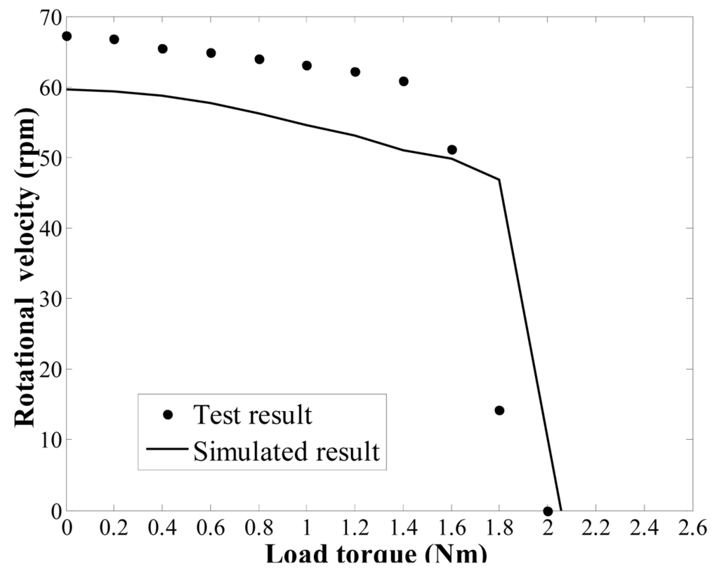 Figure 15 shows the impedance characteristics of the regulator. It is can be seen that the actual resonant frequency of the in-plane bending vibration mode (3,1) of the stator, i.e., the operating frequency of the regulator, is approximately 67 kHz. This value is slightly higher than the computational results. After that, an experimental test bench is established to measure the load torque/rotational speed relation of the regulator, as shown in Figure 16. The test bench includes a magnetic powder brake ZX-0.3YN-24 to generate the the load torque, a torque sensor (with built-in speed sensor) JN338-A to measure the load torque and rotational speed in real time, and the two equipments are produced by the MITSUBISHI Company and BEIJING SANJING Company respectively. Figure 17 shows the experimental and simulated load torque/rotational speed relation for the regulator. The round dots are the test results, and the solid line is the simulated results which is calculated by using the related parameters of the regulator depicted in Table 3.