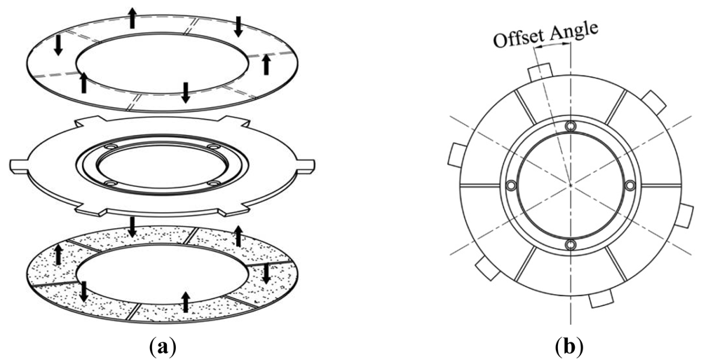 The piezoelectric stator consists of an annular elastic metal body with two annular piezoceramic discs bonded to the top and bottom. Six driving teeth are distributed equally around the outer circumference of the metal body. Each bi-directionally polarised piezoceramic disc has six uniformly polarised regions, as shown in Figure 4(a). In this figure, the black arrows represent the direction of the polarisation of each region. The two identical piezoceramic discs are bonded so that the regions in the same circumferential location on the two discs have opposite polarisations. The radial centre line of each region of the piezoceramic discsis offset by a certain angle from the midline of the nearest driving tooth on the metal body, as shown in Figure 4(b).