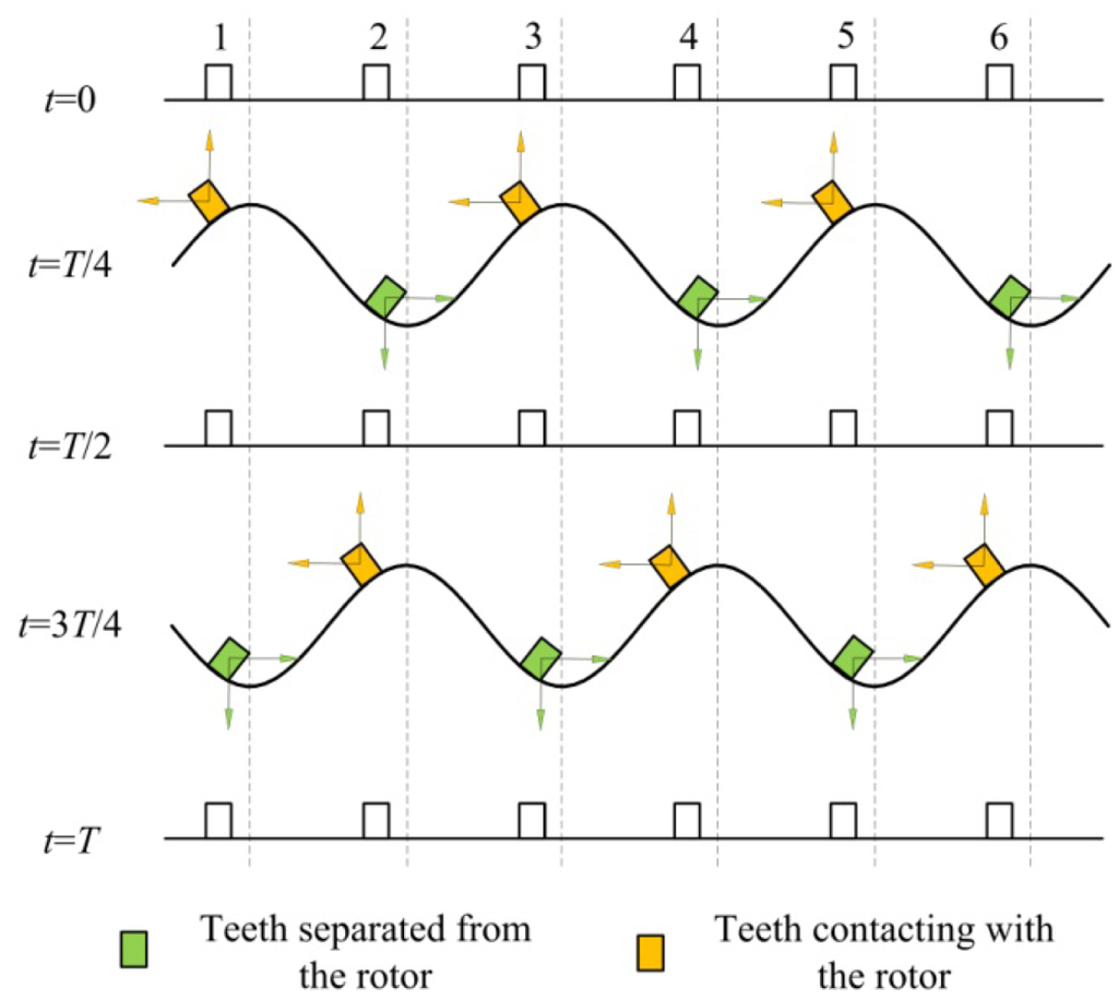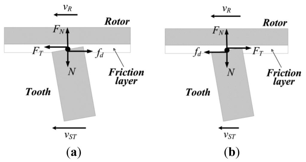 At the contact interface, while the linear velocity of the points on top of the driving teeth are greater than the corresponding points on the surface of the friction layer, the rotor is driven by the stator, and it can be thought that the friction force creates positive work, as shown in Figure 8(a). Conversely, the rotor is slowed by the stator and the friction force can be thought to create negative work, as shown in Figure 8(b). Thus, the tangential forces on rotor can be given as: