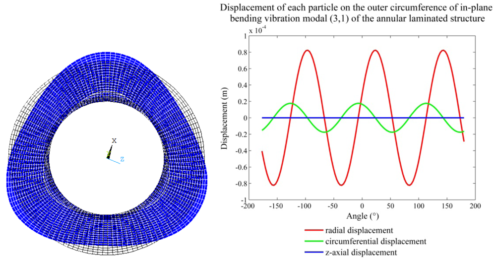 The displacement behaviour for the annular stator can be derived approximately using the analytical method for the in-plane vibration of the thin elastic plate [10]. First, a cylindrical coordinate system is established, with the annular stator axis as the z-axis and the middle annular surface of the stator as the r-θ plane. The resultant radial and circumferential displacement functions, ur and uθ, of the in-plane bending vibration mode of the annular stator structure are derived as follows [11]: