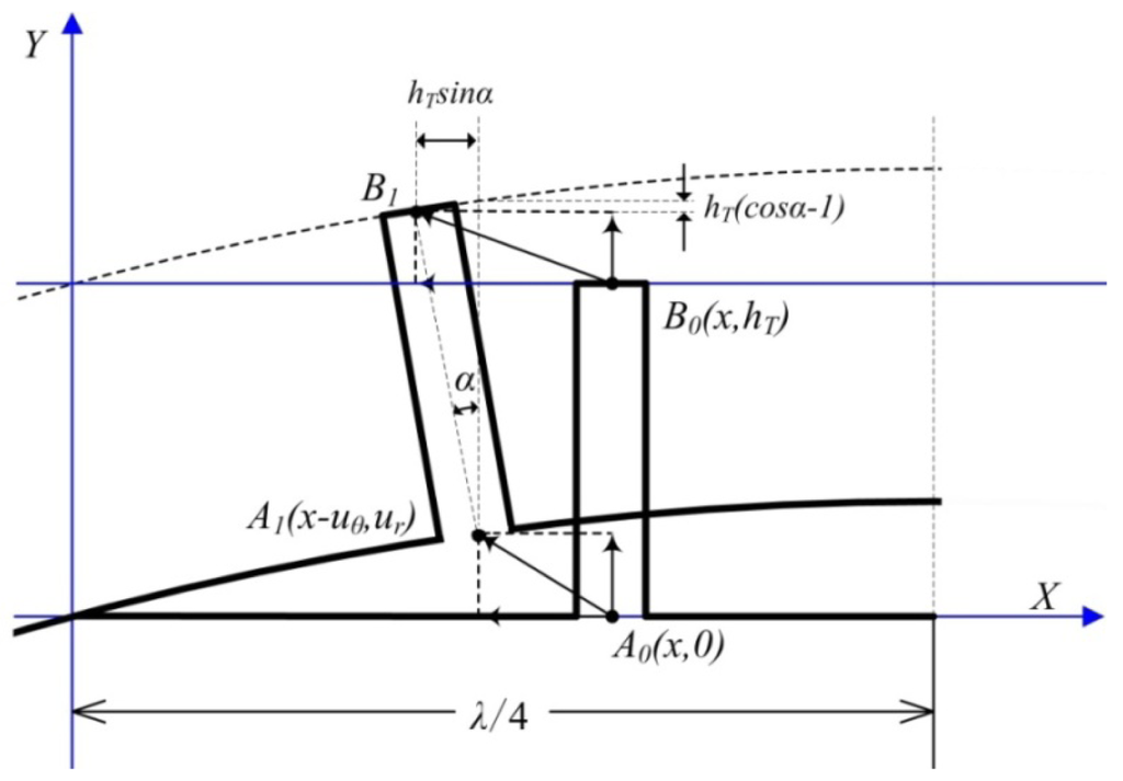 Two points are employed to perform the dynamic analysis and are located at the root and top of the stator tooth, respectively (the two points are called the root point and the top point in this paper, respectively). The variables A1 and A0 are the positions of the root point with and without deformation, respectively. The variables B1 and B0 are the positions of the top particle with and without deformation, respectively. The variable α is the swing angle of the tooth, and hT is the length of the tooth. The deformed positionA1(x-uθ, y+ur) is displaced from the initial position A(x, y) by (uθ,ur) when the piezoceramic stator is excited by a sinusoidal electric signal. The general expressions for the vertical deformation wr and the horizontal deformation wθ of the top pointare given as Equations (5) and (6), respectively: