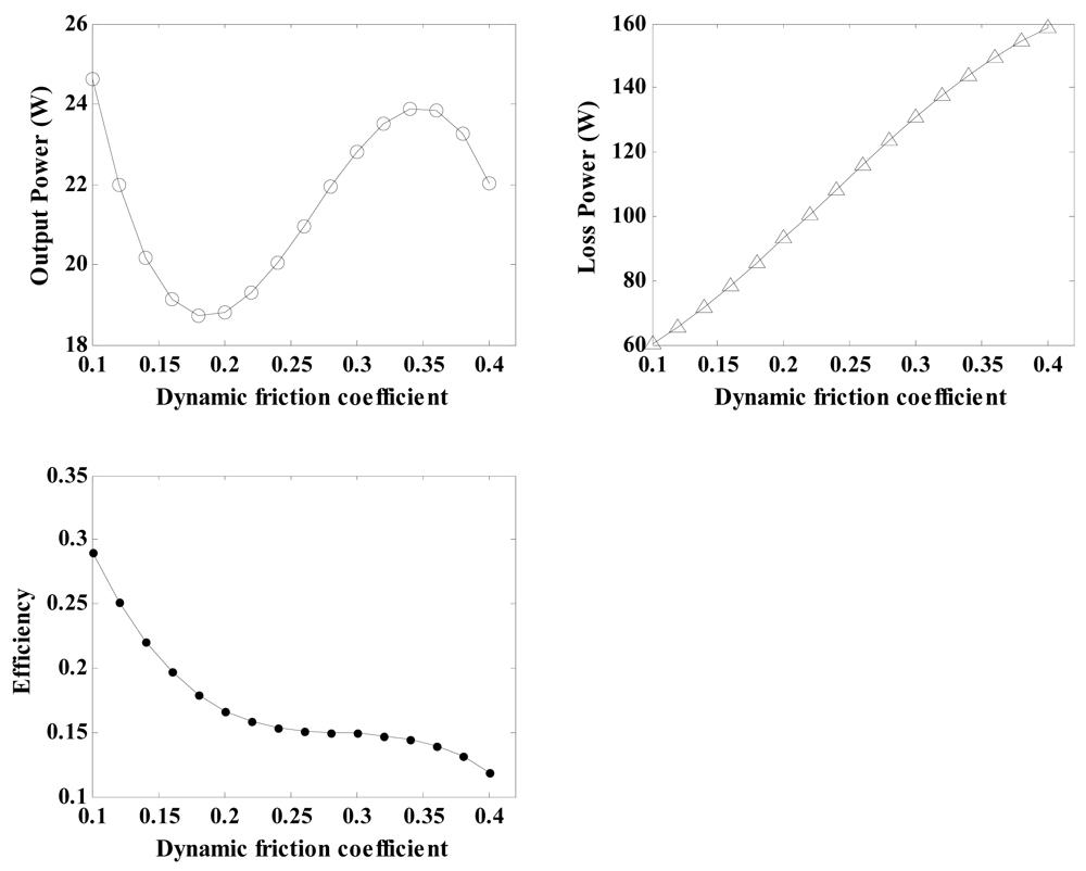 The coefficient of dynamic friction is one of the most important properties of the friction material, and it is necessary to analyse its influence on the output characteristics of the regulator. By using the related parameters of the regulator depicted in Table 3 and Equations (21), (29), (30), (31), (32), (33) and (34), the relationship between the coefficient of dynamic friction and the regulator characteristics can be calculated and shown in Figure 9. With an increase in the coefficient of dynamic friction, the loss power exhibits nearly linear growth, and the conversion efficiency curve remains approximately unchanged for coefficients of dynamic friction varying from 0.25 to 0.35. Therefore, a friction material possessing a coefficient off riction in the above range is the best choice for this analysis.