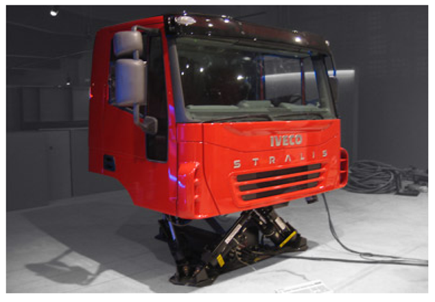 The methodology was applied to measure the weights of the parameters involved in the driving risk evaluation. As already mentioned, the data used in this paper come from the CABINTEC project. Within this project, a truck cabin simulator has been built. The simulator is a real truck cabin placed on pneumatic actuators and computer controlled, as shown in Figures 2 and 3. The environment is planned to provide all sensory information in a coordinated way to achieve realistic immersion from the beginning. The feeling is like using a real truck and the users perform a naturalistic driving style.