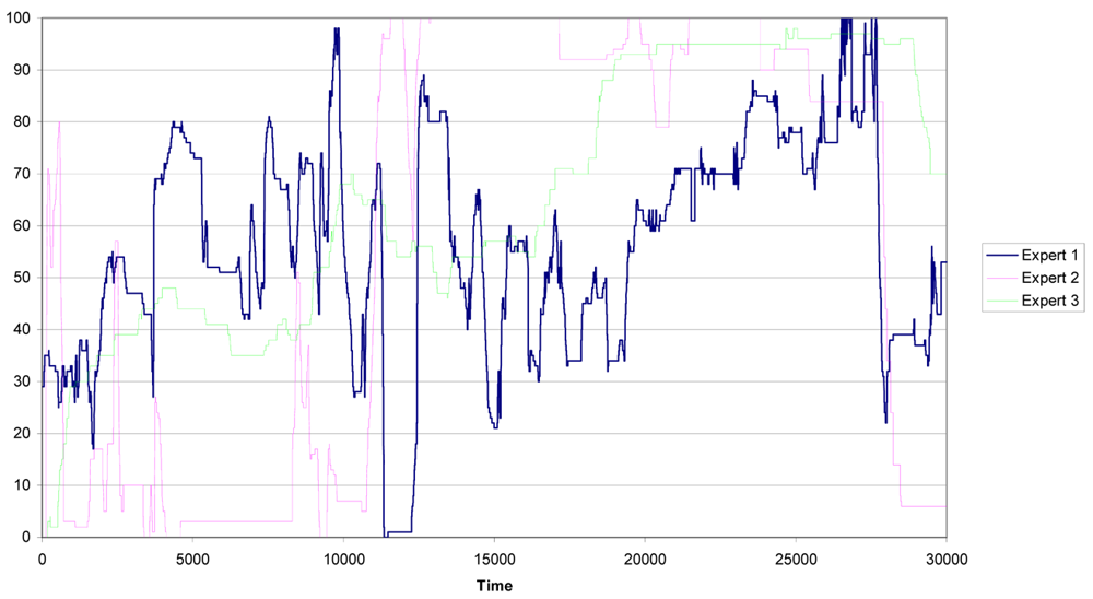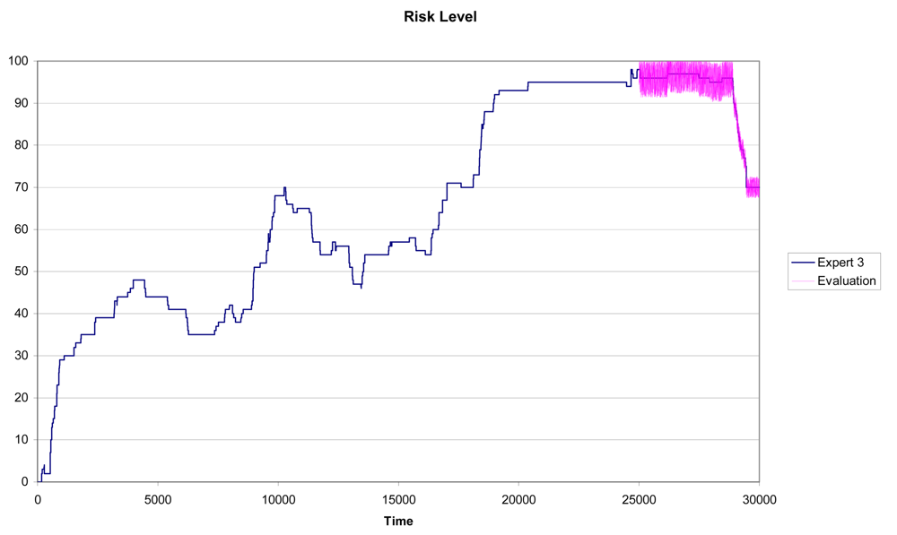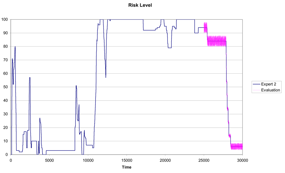 The experts evaluate the driver's behavior during 10 minutes, which corresponds to 35,000 clock cycles [19]. In the pre-processing of data the first 5,000 clock cycles are eliminated because of instabilities due to warm up and start up of the measurement process. Thus, three evaluations of the risk, one for each expert, from 0 to 100 were acquired. Therefore, each cycle segments an action with the corresponding expert evaluation. The expert evaluations are shown in Figure 4.