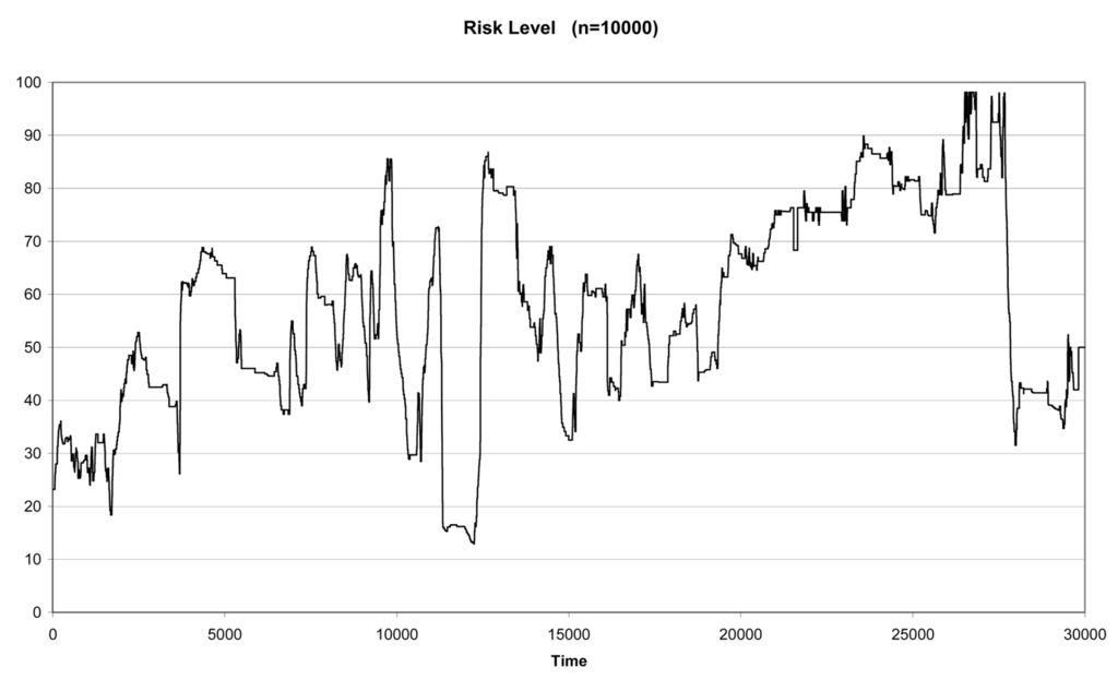 It is important to remark that the number of actions amounts to almost 60 per second. This means that we have many similar actions and, if an acquisition error occurs in one action, its influence in the overall performance of the methodology will be very low. Notice also that expert number one (the blue line) presents an evaluation of the risk more stable (with lowest variability) than the evaluation of the risk built by the other two experts (the green and pink lines).