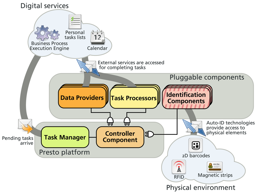 In contrast to these solutions, our approach is capable of supporting multiple tasks and multiple ID-sensing technologies thanks to its pluggable nature. Plug-ins with a well-defined function-support for task—a technology or a data source—can extend the platform to specific requirements. For each task of the business process that a user is in charge of performing, the platform is extended with a plug-in that provides the adequate interaction mechanisms for completing this task. In addition, if a plug-in that supports a new ID-sensing technology is incorporated to the platform, any of the existing tasks in the platform can immediately take advantage of the new technology.
