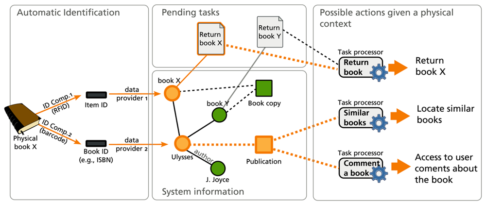 When leveraging the ID-sensing capabilities of mobile devices, daily activities become more fluid for users. For example, users in a library can borrow a book just by taking a picture of its barcode with their mobile devices. Consequently, the information system of the library registers the loan and the alarm does not go off when the book is detected at the exit of the library. In this way, each user can avoid queues by managing his/her loans autonomously. By accessing the digital services associated with the book, users can also complement their reading with the opinions of others: users can post, rate and read comments about the book. Once the book is returned, the librarian can use an NFC-equipped mobile device to query where the book should be placed just by “touching” it with the device, and immediately the corresponding location is provided to the librarian.