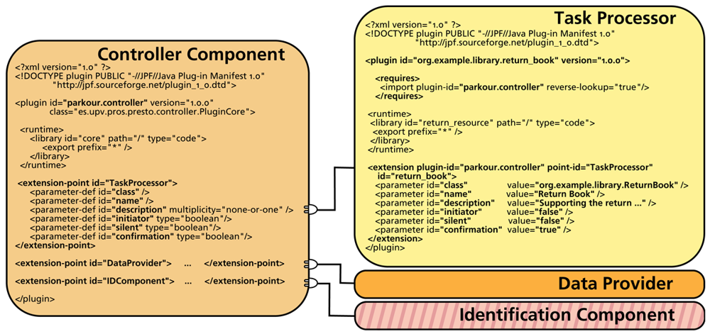Figure 3 shows the plug-in descriptor of the Controller Component plug-in. It includes the declaration of the different extension points and the information that any plug-in that extends them must provide. This figure also illustrates the descriptor for a Task Processor plug-in that extends the platform with support for the return of books task for the library scenario. It is worth noting that the attributes provided by the extender plug-ins (e.g., initiator, silent, confirmation) correspond to the ones introduced in Section 3.2.