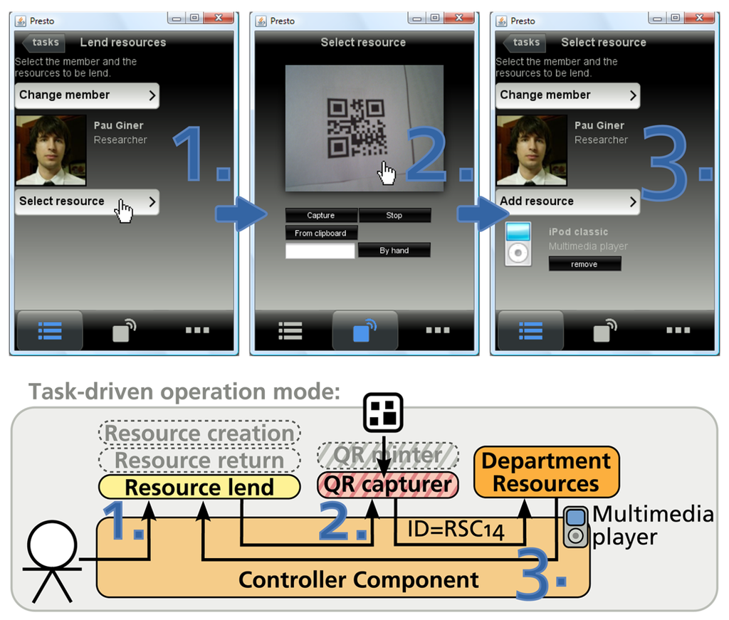 Figure 4 shows some screenshots of the developed prototype. At the top of the figure, the lending of a resource—a multimedia player—to a department member is shown. At the bottom of the figure, the exchange of information among the different components of the architecture is illustrated. The task-driven operation mode is followed in the example: (1) the user explicitly selects the task to be performed; (2) the user provides information by means of some Identification Component; and (3) the captured identifiers are translated into relevant information by a Data Provider. In contrast, if the object-driven mode were used, the step 1 in the figure would be avoided, since the Controller Component would be in charge of locating the Task Processors that are capable of handling the detected element.
