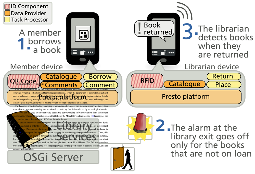 We also applied Parkour to support business processes in a library. This case study is used throughout the paper for illustration purposes. The extensibility of the platform enabled the creation of custom applications for the different business process participants just by combining plug-ins. The mobile client for the library members includes a Task Processor plug-in for each of the tasks they perform in the process—e.g., borrowing a book and comment on books—as well as an Identification Component plug-in to support QR Code-based identification. Librarians make use of the Identification Component that supports RFID technology for supporting a different set of tasks—e.g., notify return of books and place them to their shelf.