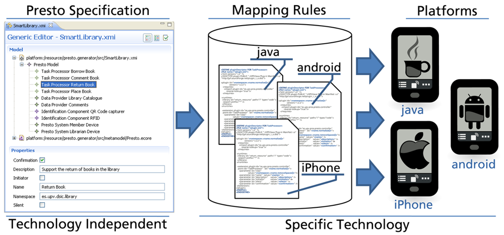 This section introduces the tool support provided for automating the development with Parkour. Tools have been defined in order to (1) specify Parkour-based solutions making use of technology-independent concepts, and (2) automate the technology mapping. The overall strategy of the approach is shown in Figure 6. Developers first specify Parkour systems in a technology-independent manner. Then, this specification is taken as input for mapping rules that are suited to specific technologies. For instance, developers specify the mobile clients of the Smart Library case study once, and then they can select rules for different technologies such as the Java platform, Android or iPhone. The following sections provide more detail regarding the tool support provided for the specification of Parkour systems, and the mapping rules defined.