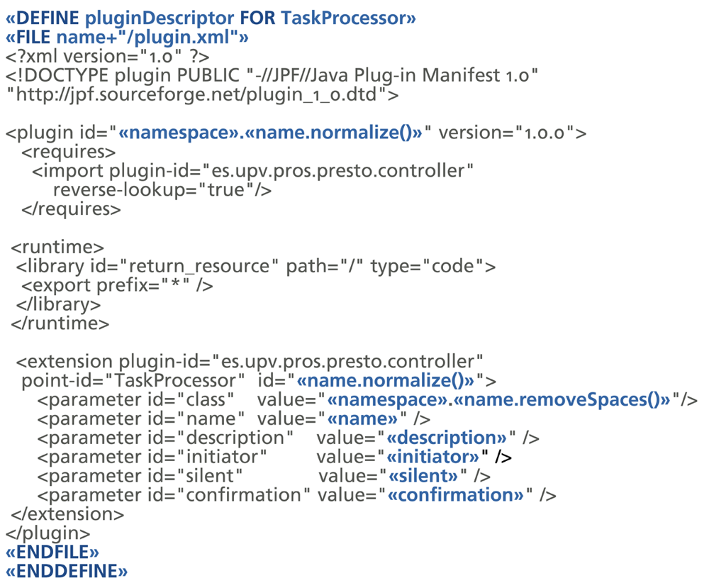 The rest of the rule is a code template with static and dynamic parts. The static pats of code are transferred to the generated code directly. In the example template, the static parts represent aspects that are common to any Task Processor plug-in such as the plug-in header—see the plug-in descriptor from Figure 3 as an example. The dynamic code is calculated for each instance to which the rule is applied. Dynamic expressions—defined between angle quotes—are used for capturing the required information and expressing it according to the target technology. For example, the ≪ name.normalize ≫ expression applies the normalize function—which replaces whitespaces with underscores—to the Task Processor name string in order to obtain an identifier for the plug-in that is valid according to JPF.
