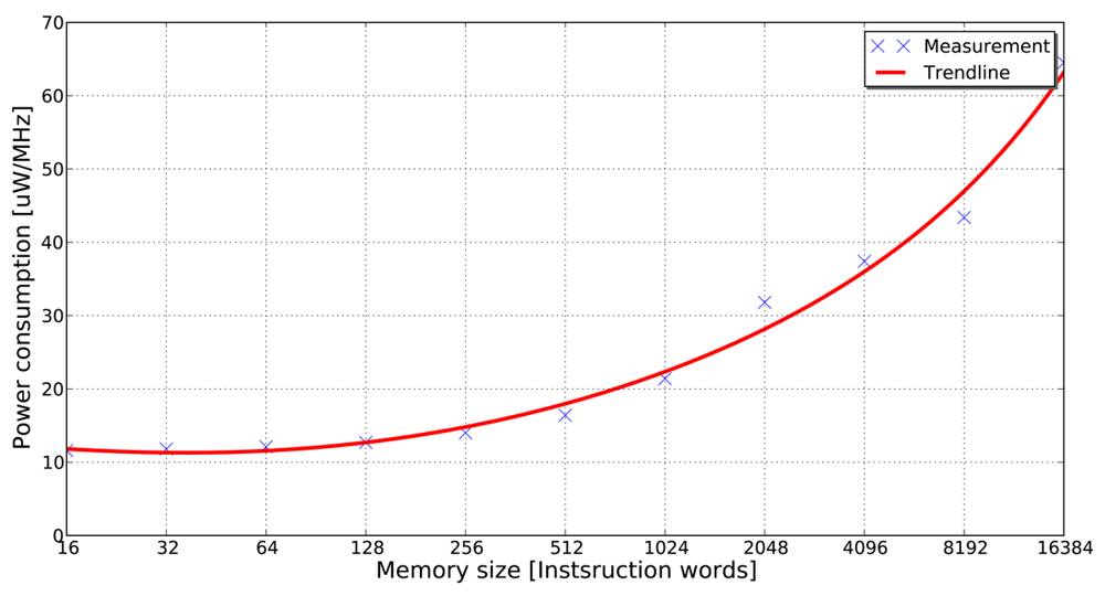 Villarreal et al. [] show that 77% of the total execution time of an application is spent in loops of 32 instructions or less. This fact demonstrates that in applications of signal and image processing, a significant amount of the total execution time is spent in small program segments. If these small program segments can be stored in smaller memory banks (e.g., in the form of loop buffers), the dynamic energy consumption of the system can be reduced significantly. The energy-saving features of the loop buffer concept can be obtained in Figure 1, where it is shown that accesses in a small memory have lower energy consumption than in a large memory. This observation is the base of the loop buffer concept, which is a scheme to reduce the dynamic energy consumption in the IMO. Furthermore, banking is identified as an effective method to reduce the leakage energy consumption in memories []. Apart from the possibility of using multiple low-power operating modes, the use of memory banks reduces the effective capacitance as compared with a single monolithic memory.