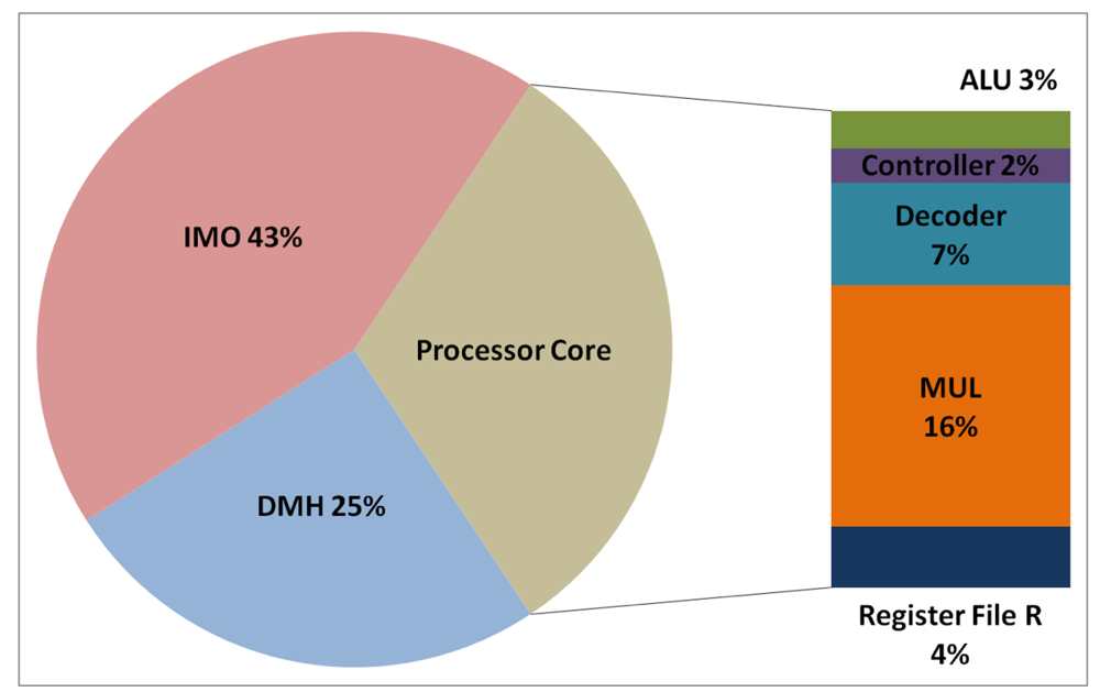 The total energy consumption of the systems that are presented in this paper is strongly influenced by the consumption of the IMO. Following the steps that are described in Subsection 5.1, Figures 12, 13, 14, and 15 present the first outcome from the experimental evaluation. Figures 12 and 13 show the power breakdowns that are related with the HBD algorithm, whereas Figures 14 and 15 show the power breakdowns that are related with the AES algorithm. In these figures, the components of the processor core are grouped. Apart from seeing how the power distribution changes from a design based on a general-purpose processor to an ASIP design, these figures demonstrate that the total energy consumption of these systems is strongly influenced by the consumption of the IMO.