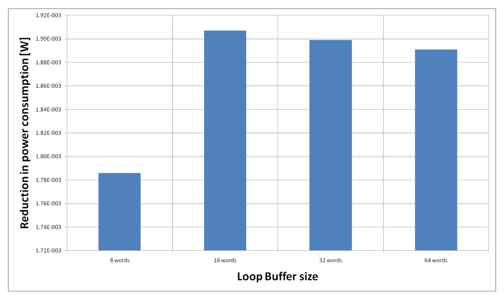 For the HBD algorithm running on the general-purpose processor, Figure 20 shows the power reductions that we can achieve for all the possible configurations. In the configuration of eight words, the 73% of the execution time of the application is on loops, while in the rest of the configurations this percentage is 79%. We can see that in this scenario, the best configuration is a loop buffer memory of 16 words, because the increase of use of the loop buffer memory compensates the penalty introduced by using a bigger loop buffer architecture.