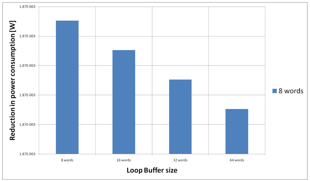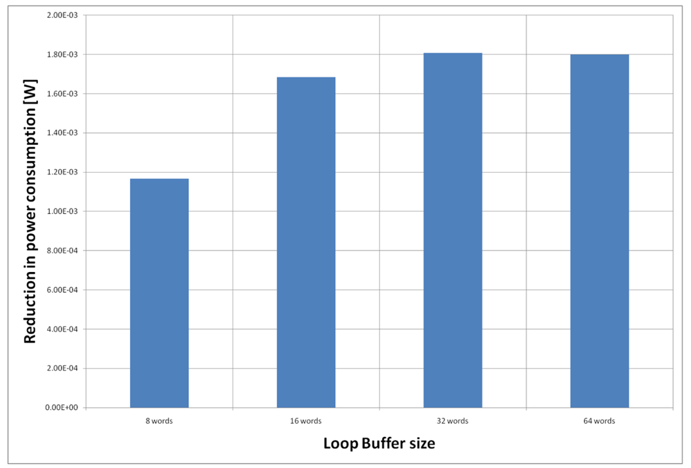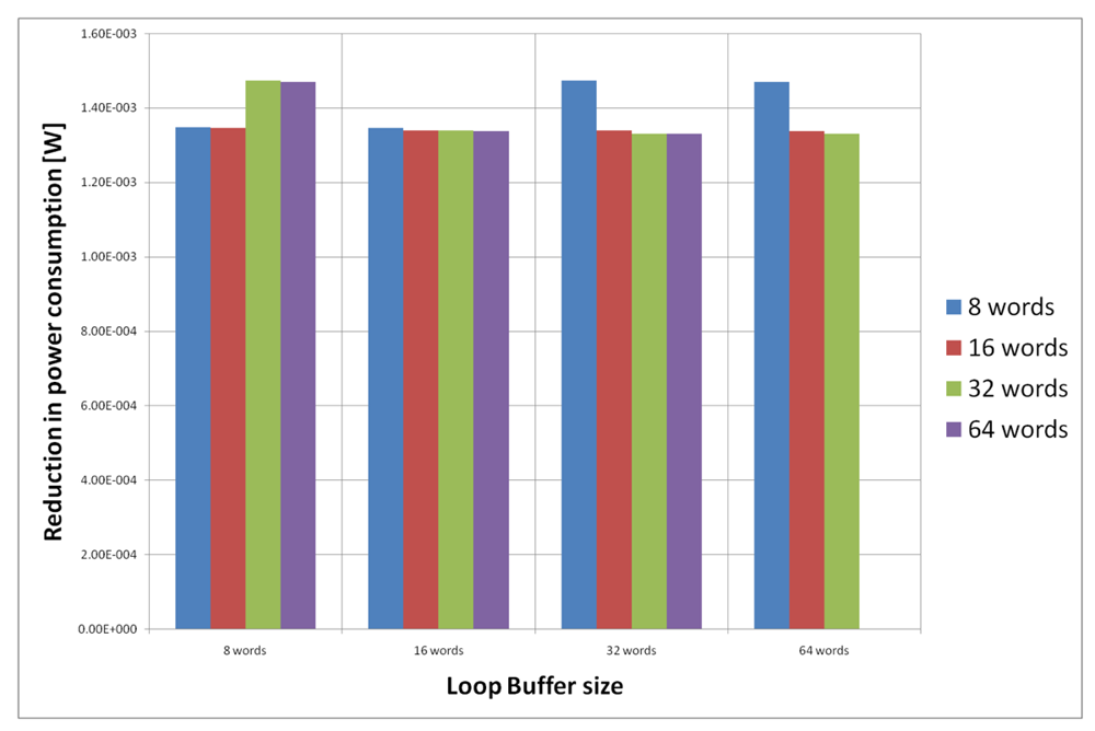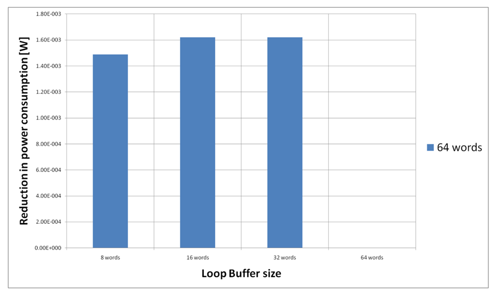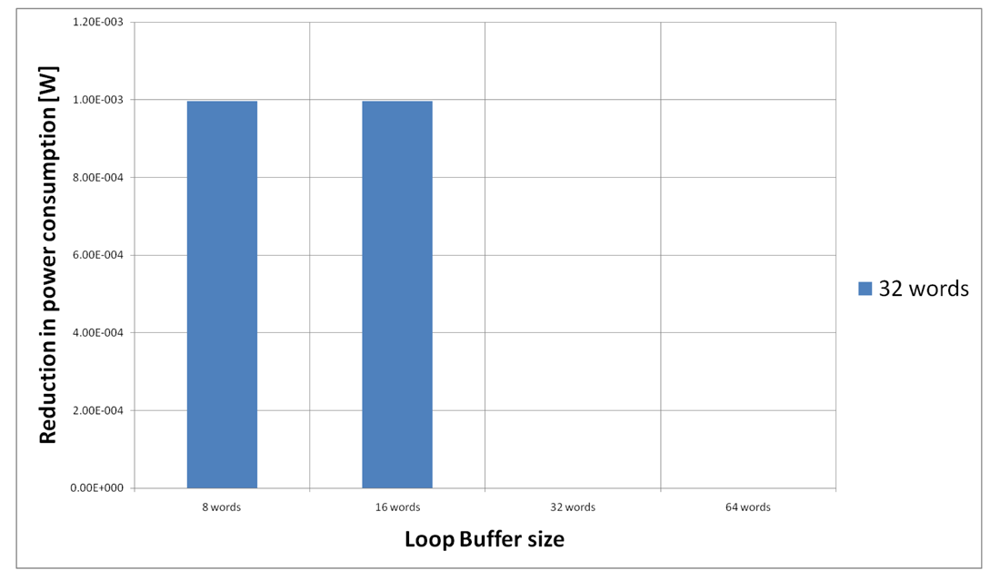 For the AES algorithm running on the general-purpose processor, Figure 22 shows the energy reductions we can achieve for all the possible configurations. In the configuration of eight words, the 47% of the execution time of this application is on loops; in the configuration of 16 words this percentage is 70%; in the configuration of 32 words this percentage is 75%, whereas in the configuration of 64 words this percentage is 77%. We can see that in this scenario, the best configuration is a loop buffer of 32 words, because the increase of use of the loop buffer architecture compensates the penalty introduced by using a bigger loop buffer memory. On the other hand, the small increase in the percentage of execution time from the configuration of 32 words to 64 words does not compensate the increase in leakage consumption that this last loop buffer architecture has.