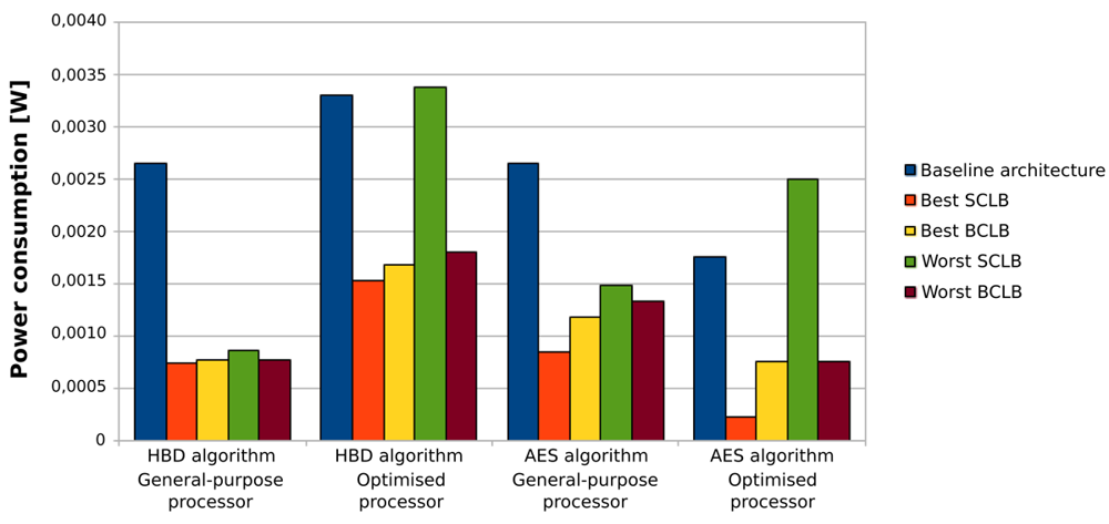 We can see from these tables that the systems that are optimised for the experimental applications always consume less power than the general-purpose systems. Therefore, the introduction of the SCLB and BCLB architectures does not affect this energy consumption trend.