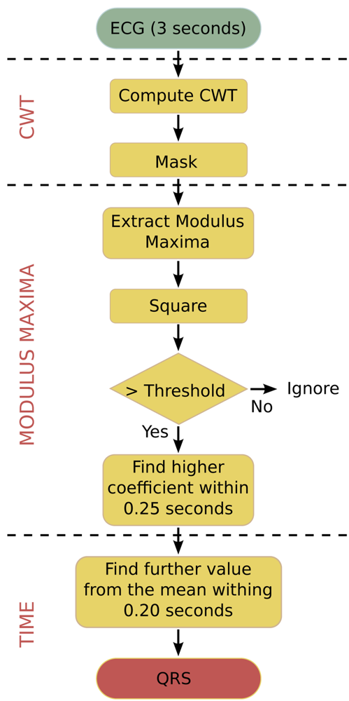 The square of the modulus maxima of the CWT is taken in order to emphasise the differences between coefficients. Values above a chosen threshold are selected as possible R-peaks.