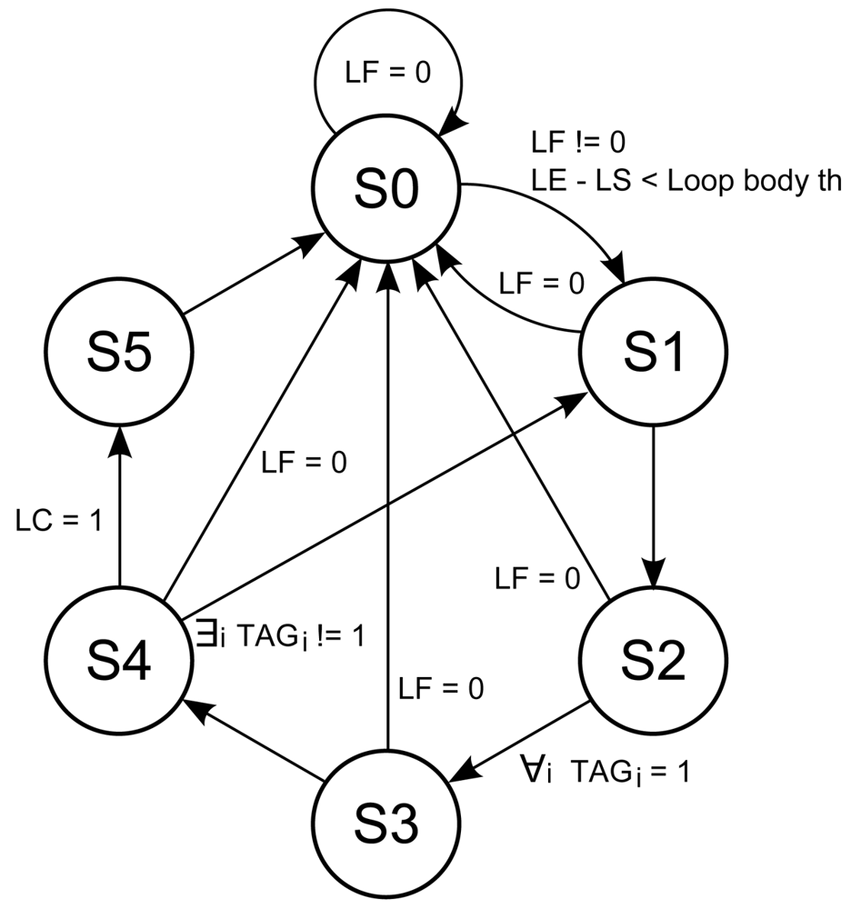 The transition states s1, s3, and s5 are necessary in order to give the control of the instruction supply from the program memory to the loop buffer architecture and vice-versa. The transition between s4 and s1 is necessary because the body size of a loop can change in real-time (i.e., in a loop body with if-statements or function calls). In order to check in real-time whether the loop body size changes or not, a 1-bit tag is used. This tag is associated with each address that is stored in the loop buffer. The loop buffer controller checks this tag to know if the address is already stored in the loop buffer or not.