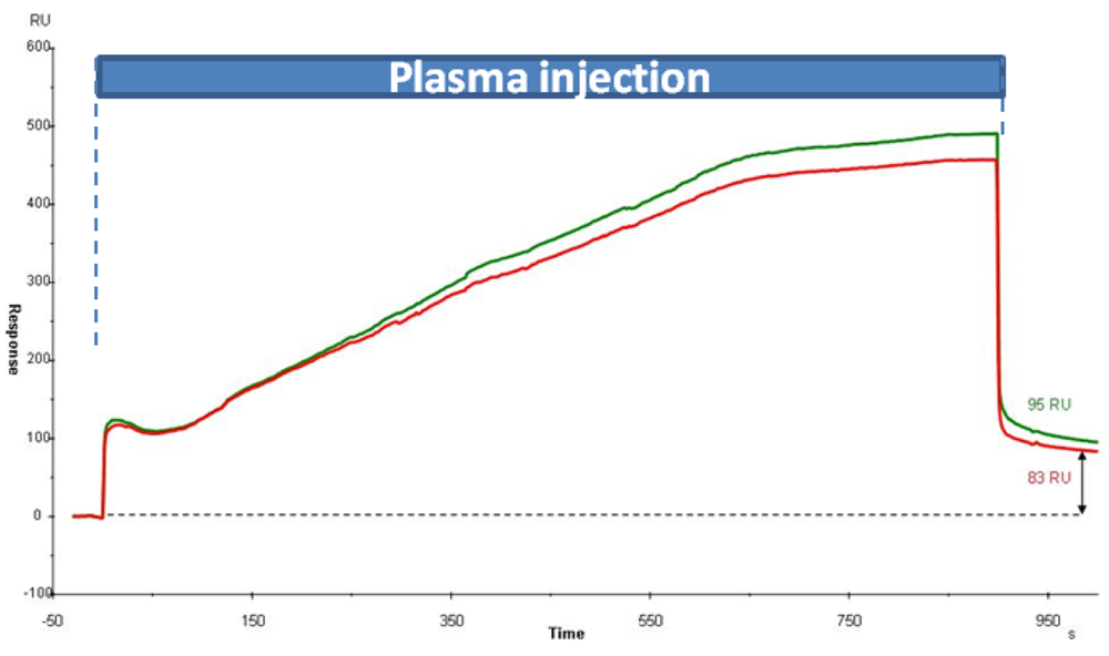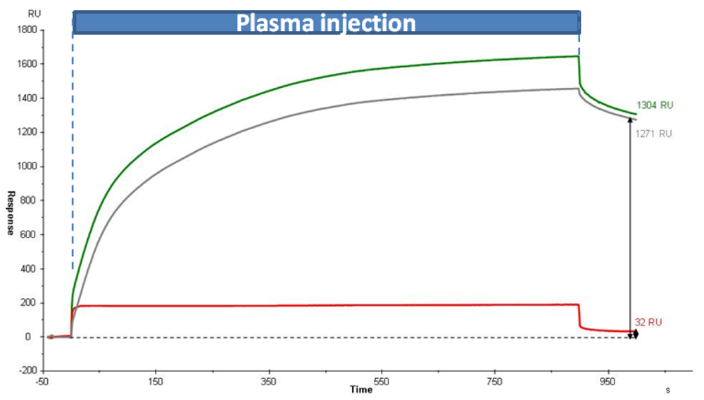 These immunochips were exposed to human plasma. Even without treatment of the biochip surface with blocking agents (such as mammalian albumin), the observation of specific antigen-mAb binding was achieved from total human plasma diluted by 40 in PBS-Tween. Results of non specific adsorption to IgGs̵ monolayers are illustrated in Figure 1. They show that unspecific binding of molecules in plasma to the mAbs has slightly increased and was saturated to 800 s during plasma injection. However, unspecific binders were removed quickly by the running buffer (900 s) indicating only weak KDs. For each plasma injection we observed that the level of non-specific adsorption is maintained below 150 RU on all our experiments, i.e., below 150 μg/mm2, without cleaning procedure nor the use of blocking agents.