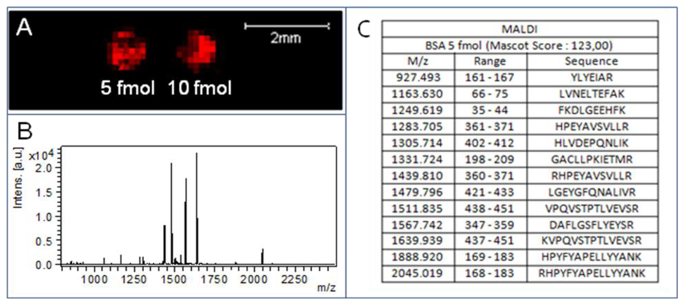 Figure 3 shows that the optimized HCCA matrix deposition procedure described in the Experimental allows one to obtain results in phase with the constraints related to the combined SPR-MS approach: good on-chip sensitivity which allow significant BSA identification at the femtomole level and no peptide delocalization after spot treatments which give confidence to array analysis.