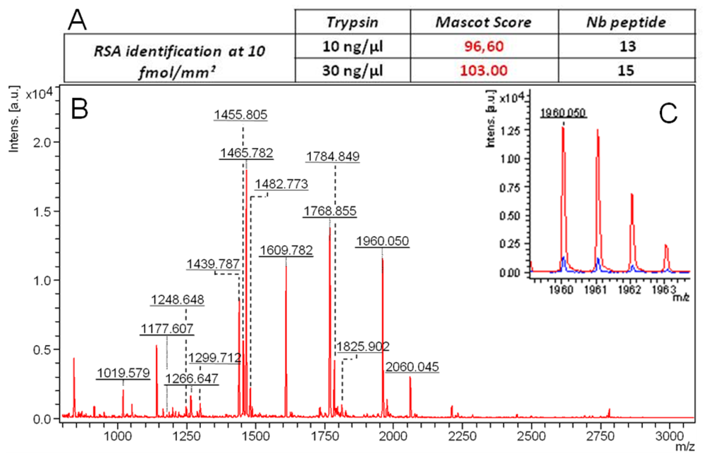 Figure 4 shows that the concentration of 30 ng/μL of trypsin sprayed is more efficient and gives an identification score of 103, with the highest [15] number of the specific RSA peptides detected. Figure 4(C) shows the intensity difference obtained between both 10 ng/μL and 30 ng/μL conditions for peptide 1960050. The sequence coverage of the matching peptides detected after reduction and digestion of the deposited RSA at 10 fmol/mm2 using 30 ng/μL of trypsin reaches 23% (see Appendix 1). The tests performed with higher concentration of trypsin (>40 ng/mL) are not conclusive because autolysis peptides of the enzyme become abundant and decrease the specific signal of the analyte (data not shown).