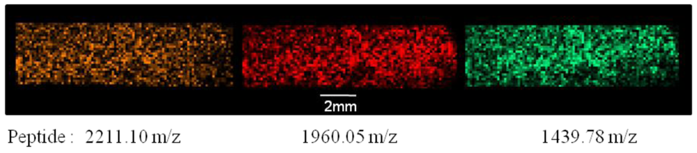 The automation of procedures through the ImagePrep will also help reducing technical variability and allow us to obtain more robust results. The procedure used to treat the sample is the same as the manual one which contains a step of reduction and digestion. Figure 5 shows the homogeneous deposit of trypsin in imaging the location of a specific peptide from trypsin (2,211.10 m/z) and two specific peptides from RSA (1,960.05 and 1,439.78 m/z). The homogeneous deposition of the enzyme provides good intrabiochip reproducibility, but also allows treating up to four biochips simultaneously, thus ensuring a comparable analysis between biochips which have been exposed to different types of biological samples. The good reproducibility is also provided by the controlled atmosphere of the ImagePrep which prevents the influence of outside temperature and the hydrometric degree onto the enzymatic activity and the speed of matrix crystallization.