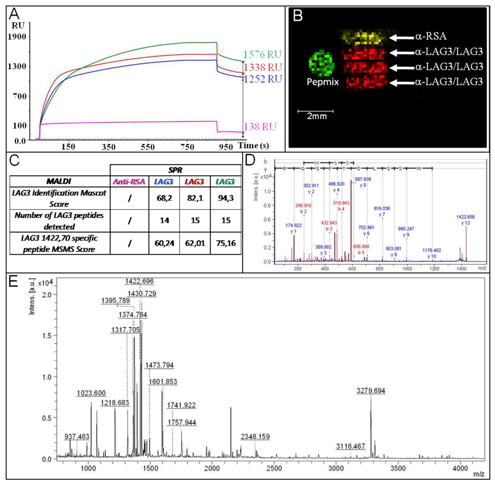 The number of peptides detected and the sequence coverage (SC = 39.6 %, see Appendix 2) are similar to values acquired with more classical analysis obtained by in-gel digestion [17]. This fine correlation and peptide distribution across the LAG3 sequence indicates that the on-chip digestion is efficient and not affected by the biochip interface. Furthermore, the MALDI-MS imaging analysis of the SPR channels provided additional indications for the specificity of SPR and MALDI-MS combination by the peptide distributions of m/z 1,422.69 specific to LAG3 and m/z 1,697.20 specific to α-RSA. The Pepmix (Peptide Calibration Standard) spot was manually deposited for PMF calibration before launching the MALDI-MS imaging analysis and the peptide distribution of m/z 1,296.68 specific to Pepmix was only detected on the spot. The LAG3 peptide was only detected on the α-LAG3 arrays, and the α-RSA peptide only on the α-RSA control array. As illustrated in Figure 6(B), no peptides were detected outside the spots, demonstrating the absence of delocalization and cross contamination between the Biacore arrays after (bio)-chemical treatment and matrix deposition.