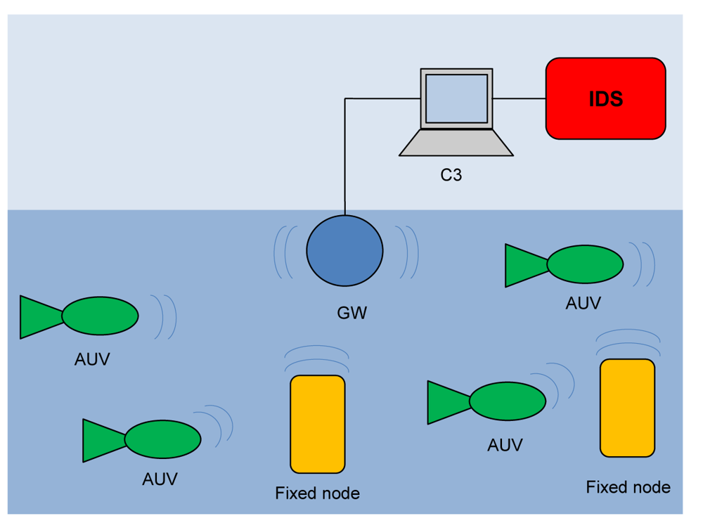 Every node is equipped with a number of sensors that allow it to both sense the state of surrounding waters and detect the presence of targets in the neighbourhood. Of course, a node may only achieve a local partial view of the state of the system. For this reason, several nodes are deployed around the critical asset and each of them reports the sensed data to a Command and Control Center (C3) station. Such a station collects sensed data from underwater nodes, so achieving a global view of the system (e.g., it performs the intrusion detection algorithm).