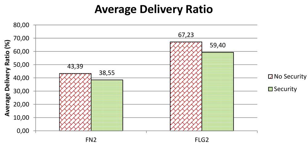 Underwater acoustic communication is particularly affected by noise and subject to the highly variable sea environmental conditions. For this reason, an increased message length due to security might reflect in an increased likelihood of message loss or corruption. In order to evaluate this impact of security on performance we have considered Average Delivery Ratio (ADR), which is the ratio between the average number of received messages and the number of sent messages. In practice, the average delivery ratio measures the fraction of messages the network is able to deliver. Ideally, the ADR should be equal to 1.