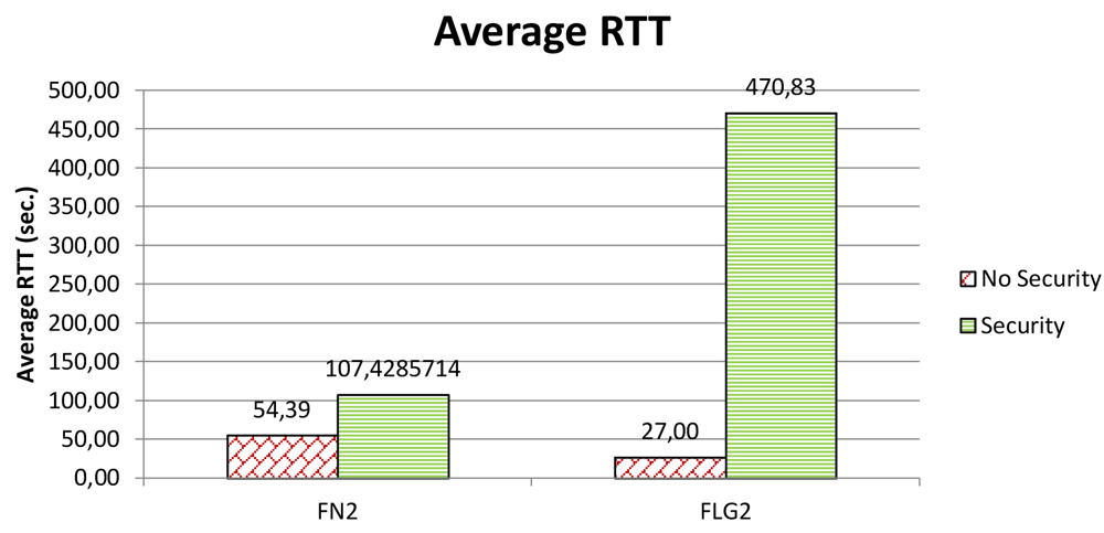 In the experiments, the payload varied in between 32 and 78 bytes. This means that the 4 bytes message size increment due to security varies in between 5.13% and 12%. This increment, of course, reflects on the increased transmission time.