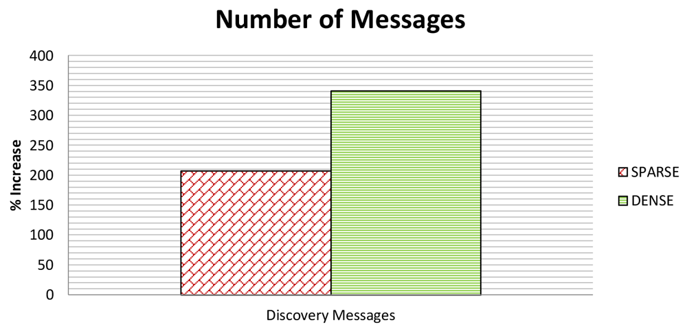 Figure 13 shows the NoM in both the dense and sparse scenario. As to NoM, we only consider the discovery messages and neglect the add and delete messages because SeFLOOD does not add messages to the Reconfiguration Phase and thus SeFLOOD and FLOOD have the same number of messages in this phase. Figure 14 shows NoB, which, instead, considers all types of messages.