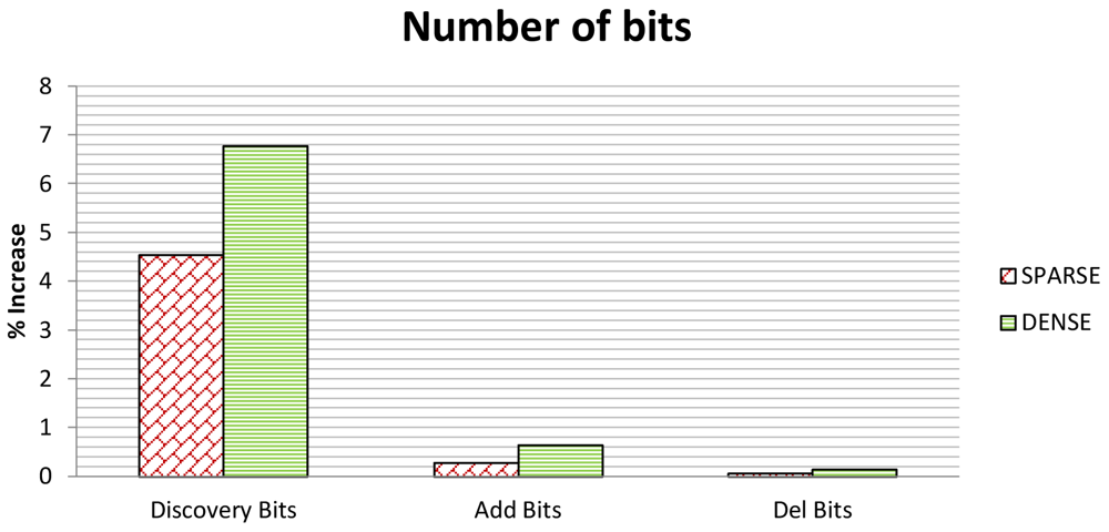 From these considerations, it turns out that although the CKDP protocol causes additional messages, the resulting overall additional traffic may be negligible with respect to the FLOOD discovery traffic. In details, FLOOD sends 144,580 bits in the dense scenario and 88,856 bits in the sparse one, while CKDP sends 9,792 bits in the dense scenario and 4,032 bits in the sparse one. Therefore, NoB is ≈ 6% in the dense scenario and ≈ 4% in the sparse one.