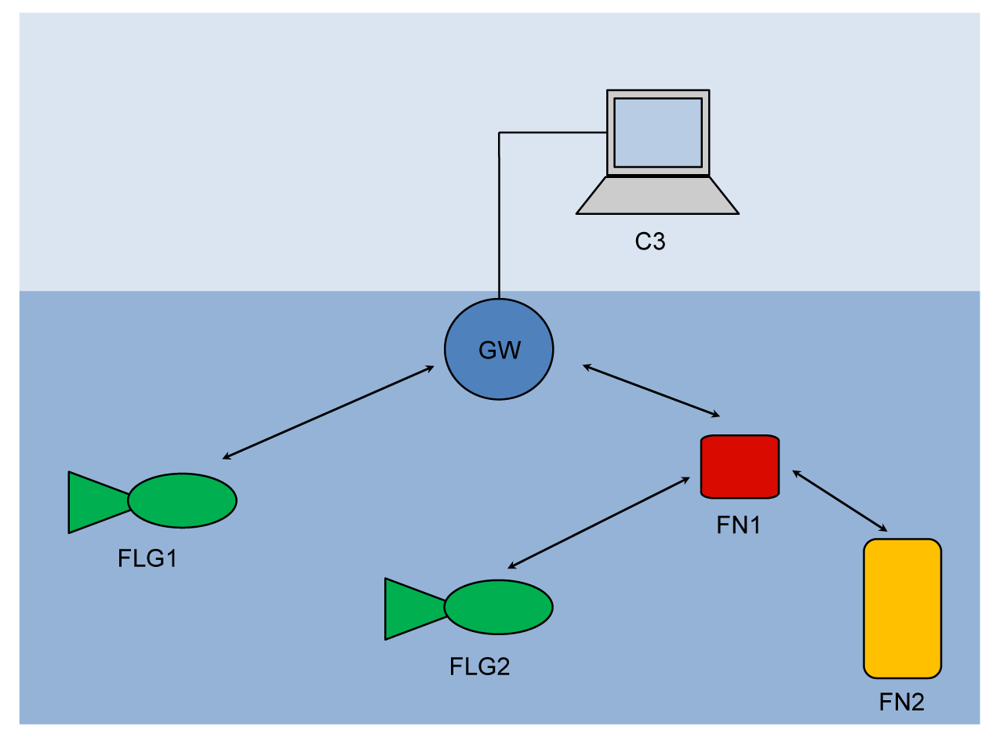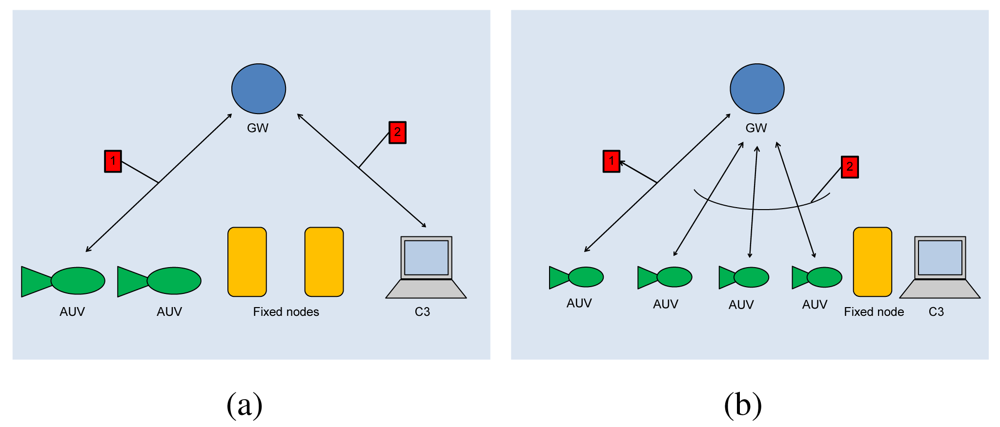 The gateway (GW) is a node located close to the asset and capable of both radio and acoustic communication. The gateway is not energy constrained as it receives power from the asset through a power cable. In the one-to-one communication paradigm, the gateway GW relays messages between underwater nodes and the C3 station (see Figure 2(a)).