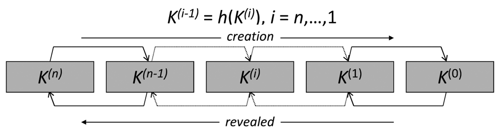 In short, the key authentication mechanism levers on key-chains, a technique based on Lamport's one-time passwords. A key-chain is a set of symmetric keys so that each key is the hash pre-image of the previous one (see Figure 3). Hence, given a key k(i) in the key-chain, anybody can compute all the previous keys k(j), j ≤ i, however nobody, but the key-chain creator, can compute any of the next keys k(j), j > i. Keys are revealed in the reversed order with respect to creation order. Therefore, given an authenticated key in the key-chain, anybody can authenticate the next revealed keys by simply applying a hash function. For example, if k(i) is an authenticated key, than anyone can verify the authenticity of k(i+1) by verifying that k(i) = h(k(i+1)). We call current key of a key-chain the last revealed key of the key-chain and next key the hash pre-image of that key. We denote them by k and k+, respectively. Notice that k = h(k+).