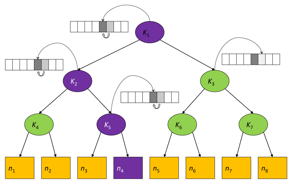 To reduce the communication overhead, the gateway GW maintains a logical key tree (see Figure 4) where each internal node is associated to a key-chain and each leaf is associated with a node's node-key (i.e., the secret key that the node shares with GW). We denote by ki the current key of the hash-chain associated with the internal tree node i. Keys in the hash chain are only used in the rekeying process and thus are called key encryption keys (KEKs).